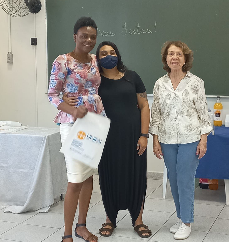 No último sábado, 10 de dezembro de 2022, professores e demais voluntários se reuniram para um momento de celebração junto aos alunos e alunas do Projeto Língua Portuguesa e Cultura Brasileira para Imigrantes e Refugiados. Aos estudantes foram conferidos os certificados do semestre e aos voluntários as declarações de trabalho voluntário. Com a ajuda de nossos parceiros, pudemos nos confraternizar em torno de uma mesa repleta de delícias brasileiras, como bolos e uma variedade de salgados. Também houve cantos em português, espanhol e inglês, e até uns passinhos animados de dança. Agradecemos à reitoria, à equipe de eventos, aos nossos parceiros e a todos os voluntários e voluntárias por sua disponibilidade e dedicação carinhosa a esse grande serviço de amor e solidariedade. Parabenizamos aos alunos por seu empenho e perseverança no aprendizado de nosso idioma, bem como por seu esforço de adaptação ao contexto brasileiro. Aproveitamos para desejar a vocês todos um Natal abençoado e um ano de 2023 repleto de paz, alegria e saúde.